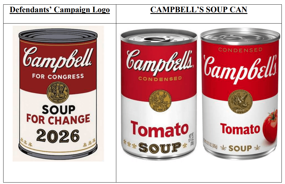 In its suit filed last week, Campbell’s is claiming that the candidate’s “Soup 4 Change” slogan and unauthorized use of the Campbell’s logo and soup can label design are causing “consumer confusion about potential endorsement.” The plaintiffs point out that after receiving a “cease-and-desist” letter last month, candidate Campbell dismissed the warning and proclaimed that a public battle with the food giant would help her win the election.